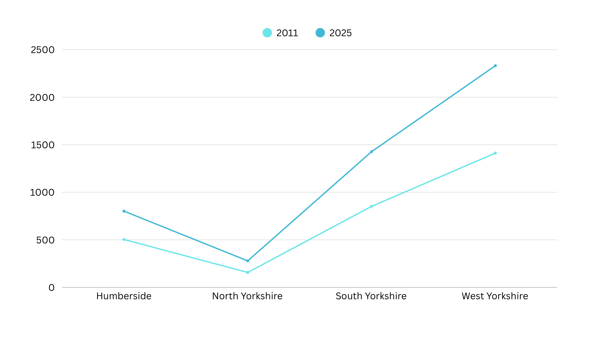 Line graph showing the increase in knife crime across Yorkshire’s counties from 2011 to 2025