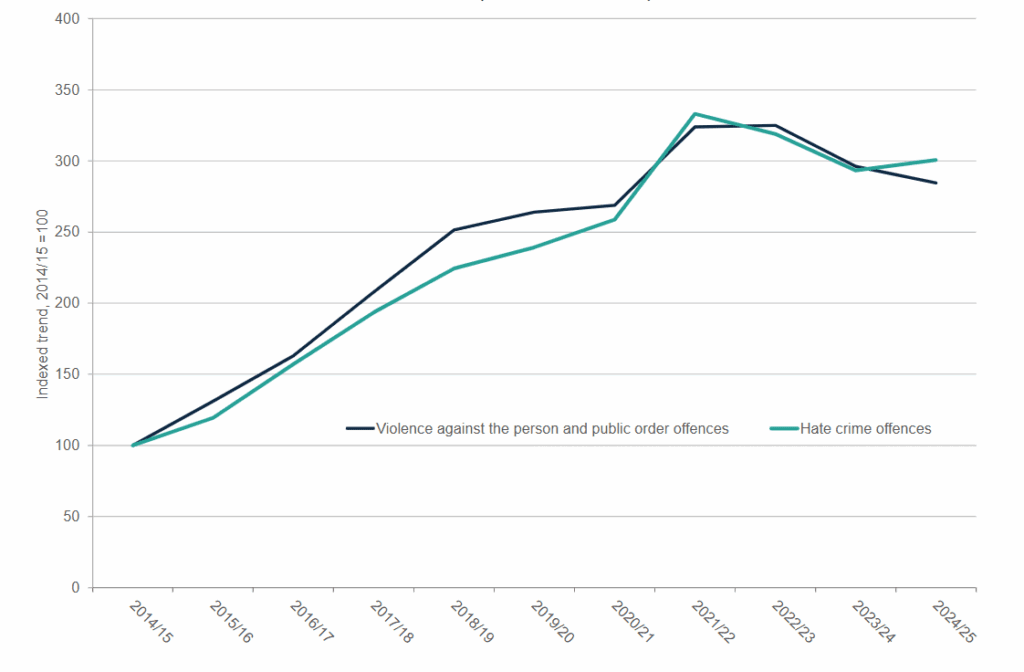 Figures from the Home Office show the number of recorded hate crimes in England and Wales, excluding the Metropolitan Police (MPS), rose by 2% in the year ending March 2025.