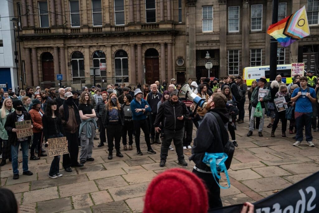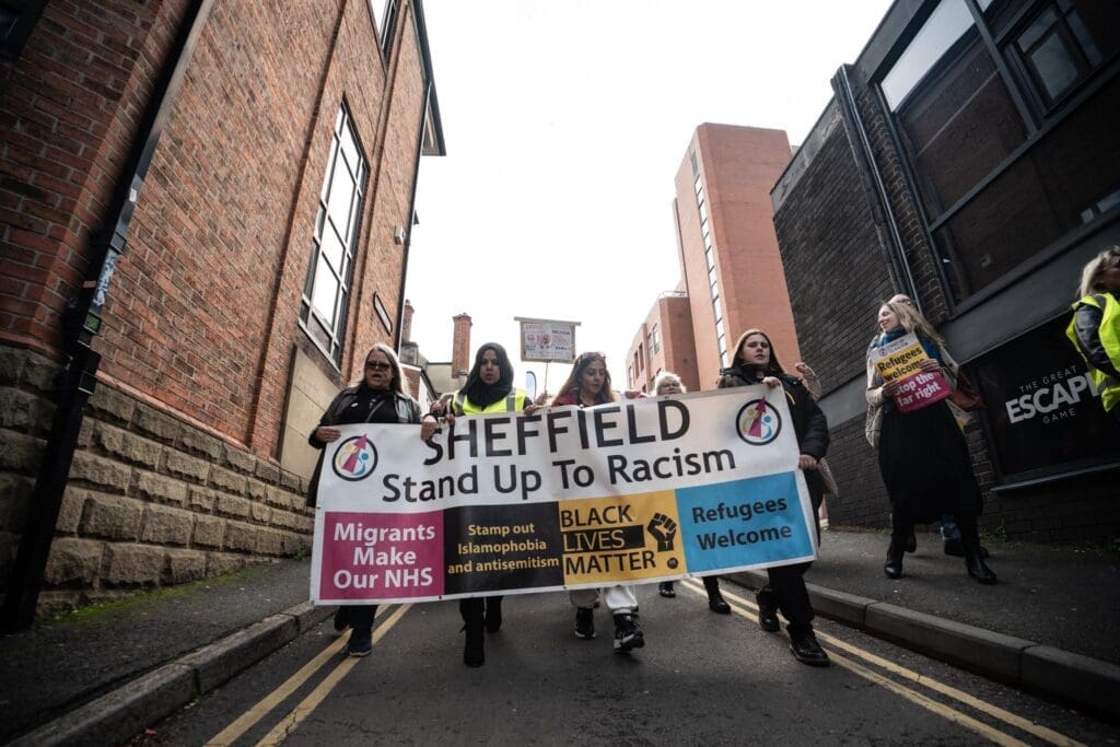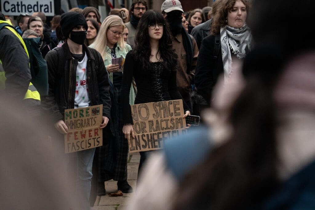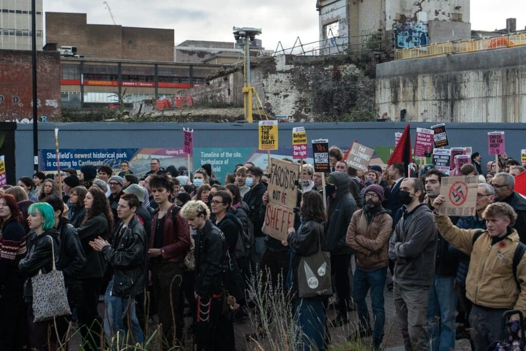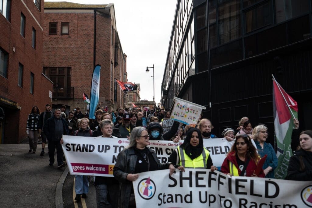 Counter-protestors from groups including Stand Up to Racism gathered first near Sheffield Cathedral before marching towards Castlegate, chanting “Refugees are welcome here.”