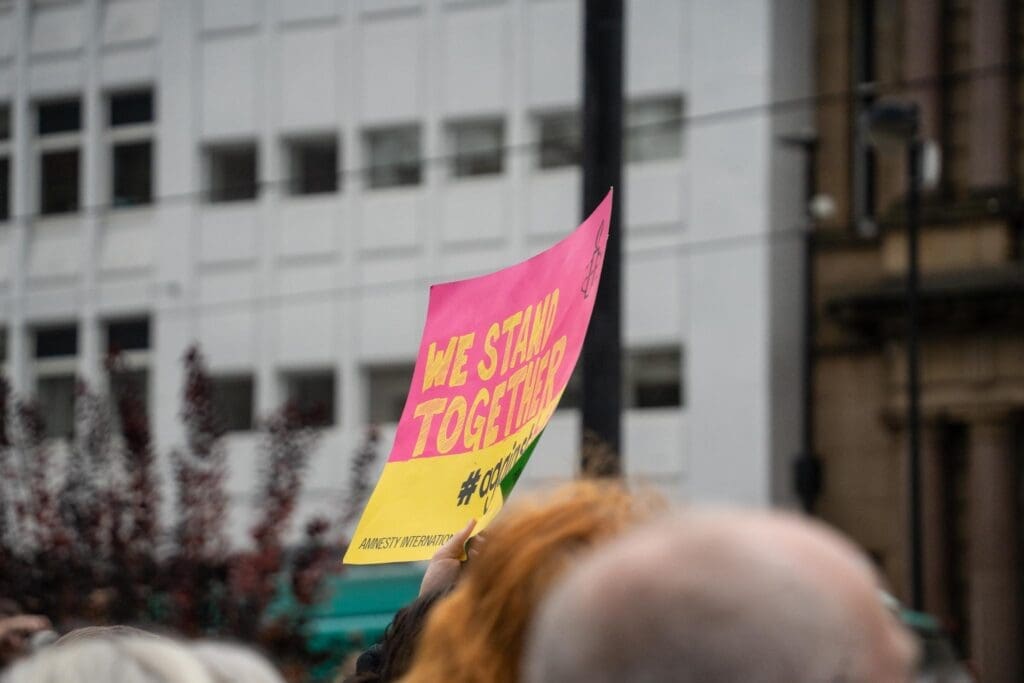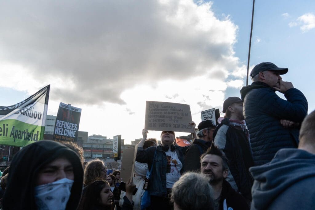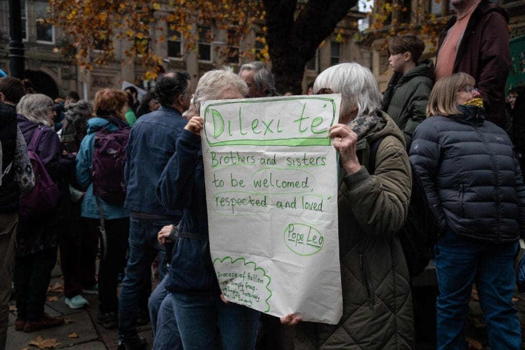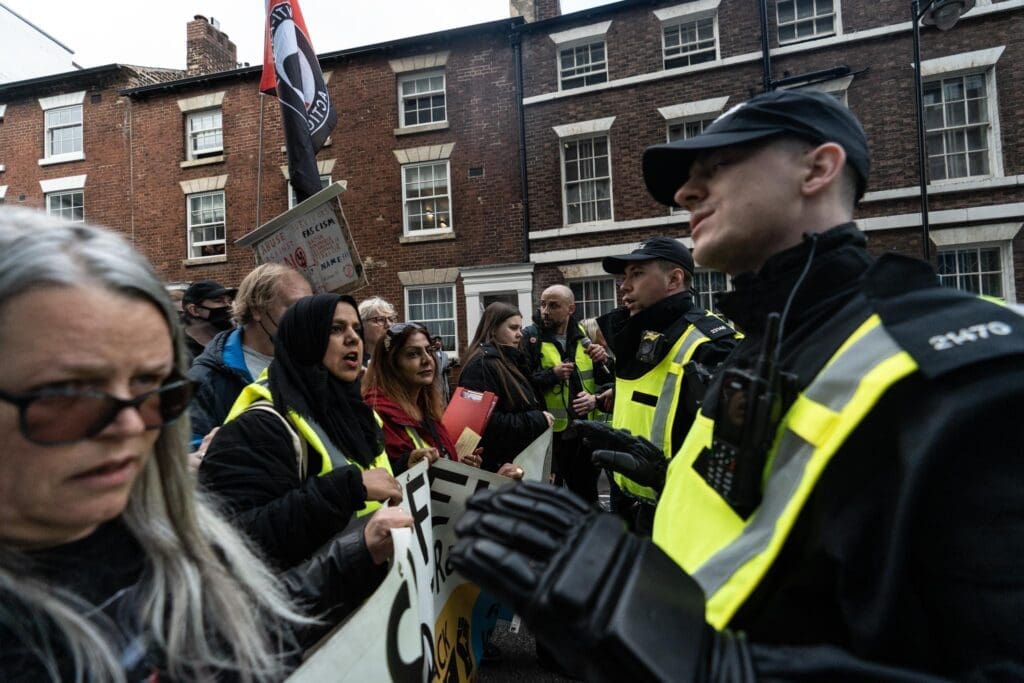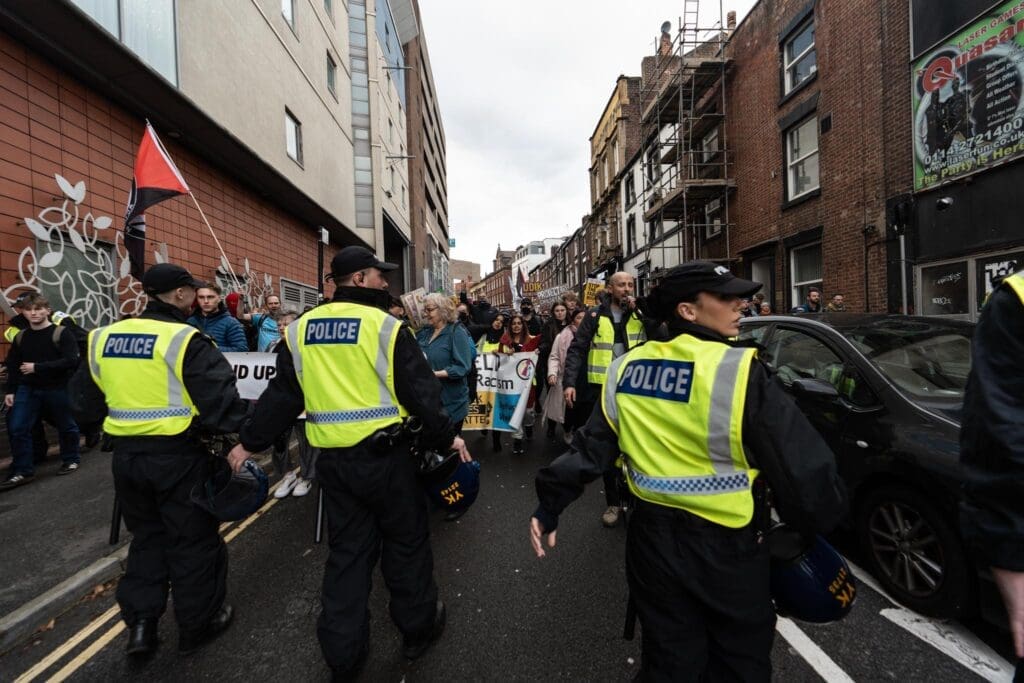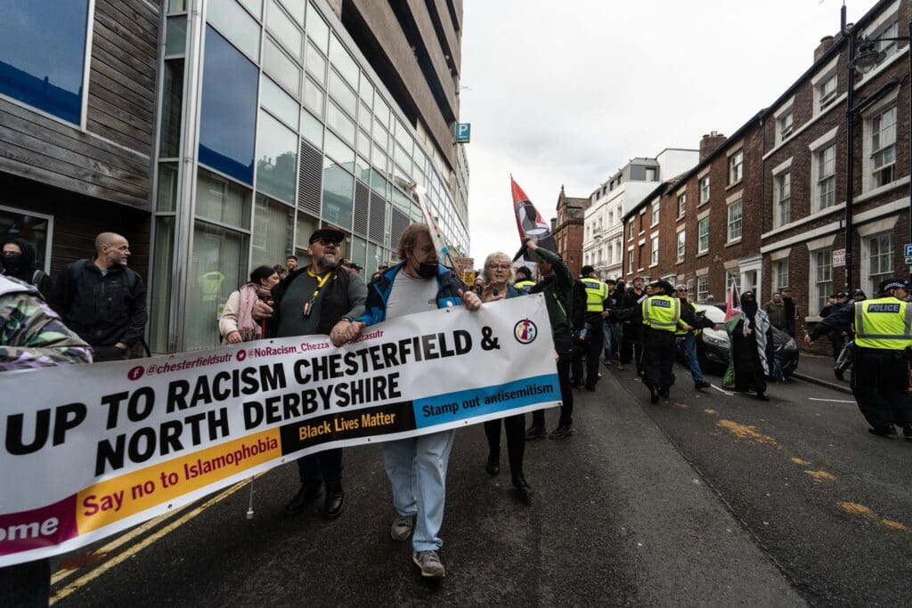 Counter-protestors from groups including Stand Up to Racism gathered first near Sheffield Cathedral before marching towards Castlegate, chanting “Refugees are welcome here.”