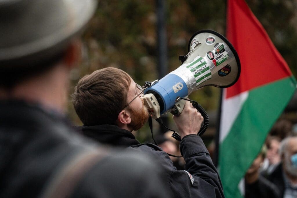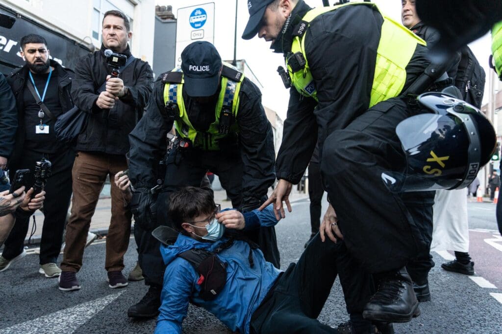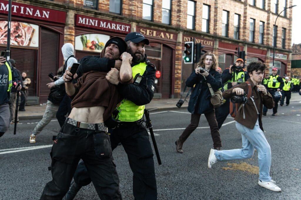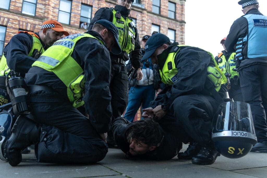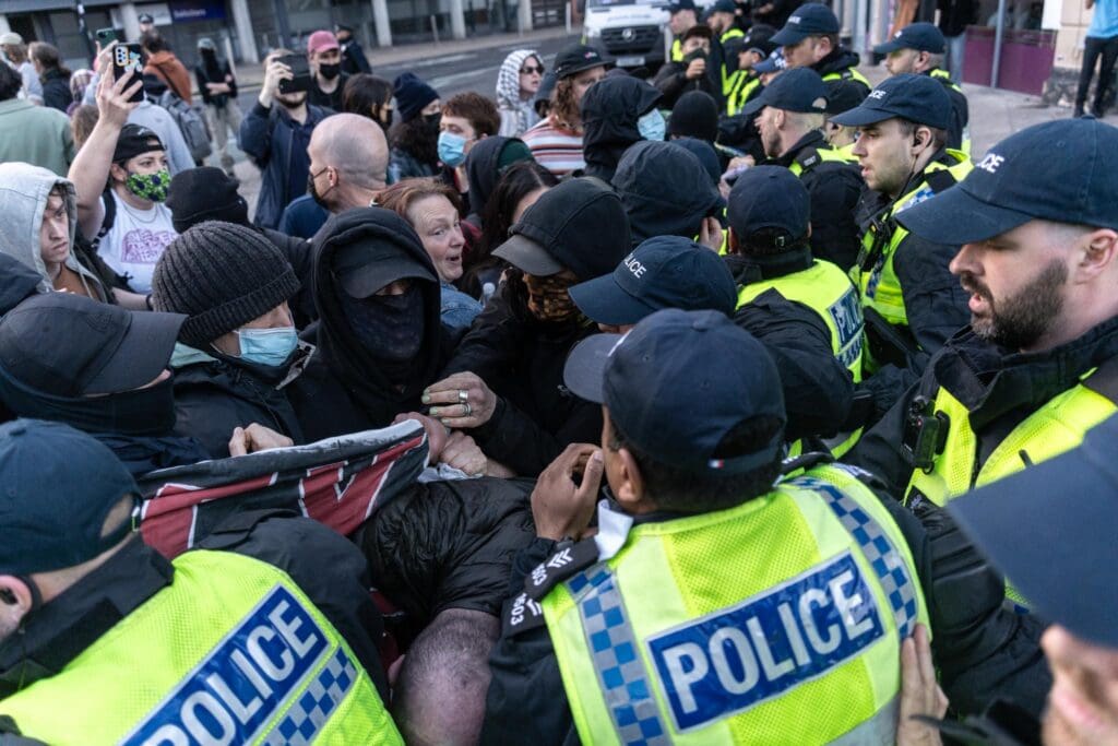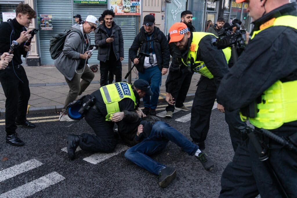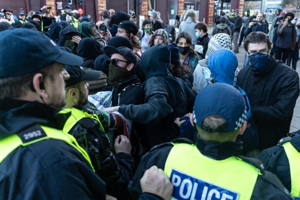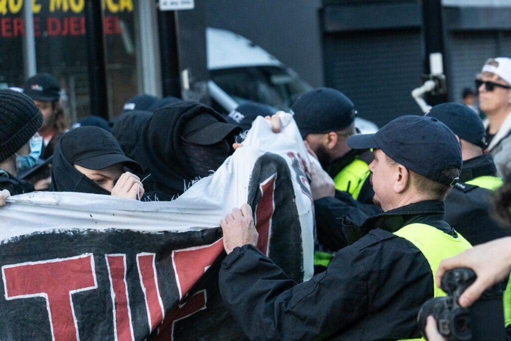 Several arrests were made after physical altercations erupted, with at least one counter-protestor detained and others pushed to the ground as police attempted to maintain order.