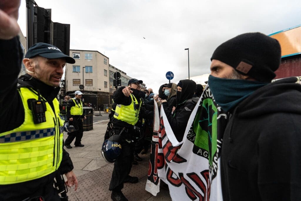 Despite a heavy police presence, scuffles broke out as both sides exchanged chants and insults across barricades.