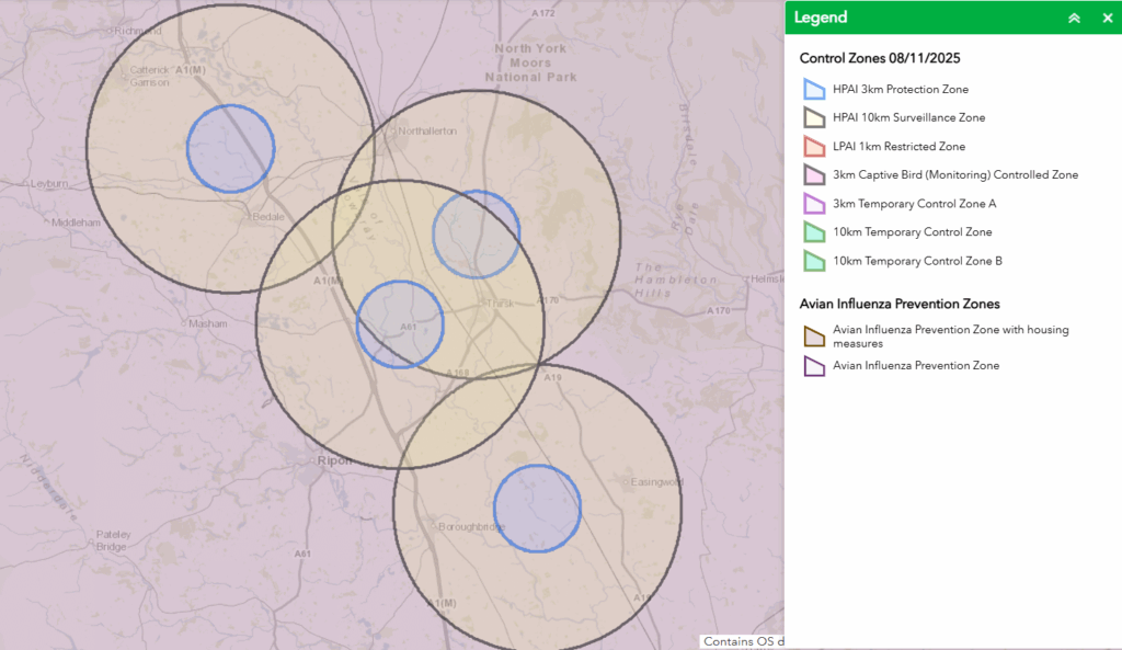 Control zones have been set up across Yorkshire after confirmed cases in Thirsk, Hackforth, Bedale, Tholthorpe, Easingwold and Knayton, each one consists of a 3km protection zone and a 10km surveillance zone.