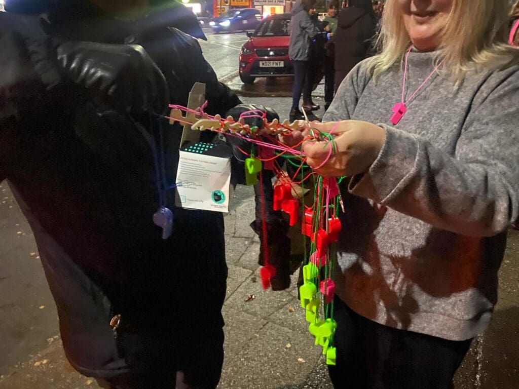 6:57pm: People are handing out glow sticks and whistles amongst the crowd.
