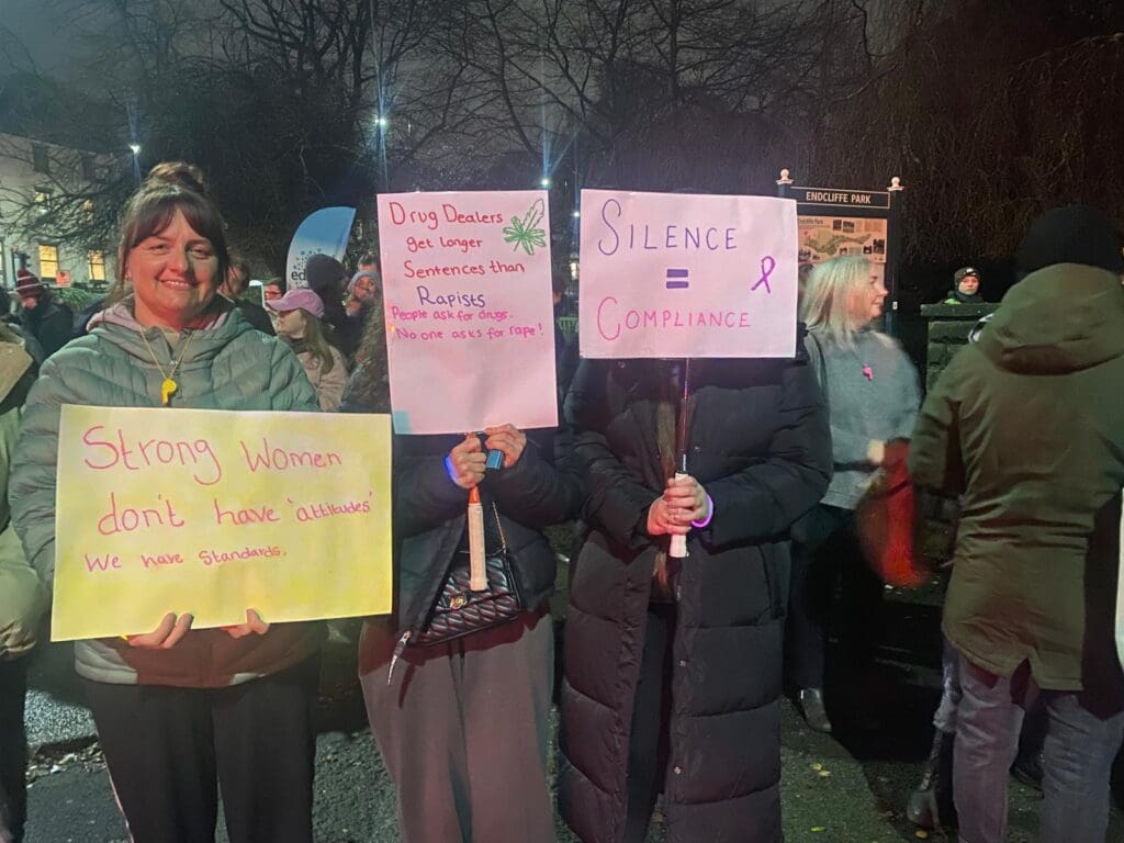 7:01pm: Attendees have arrived with home-made signs. One sign reads: “Strong women don’t have ‘attitudes’. We have standards”. Another says: “Silence = Compliance”.