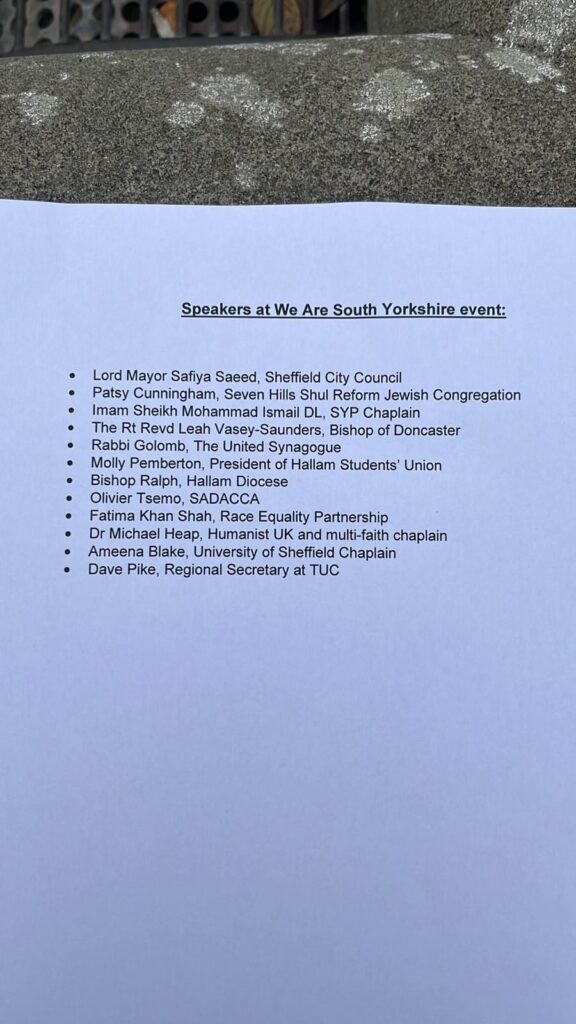 The event, titled 'We are South Yorkshire' is a chance for people to stand together and listen to an array of speeches from a number of people including representatives from faith groups and community organisers.